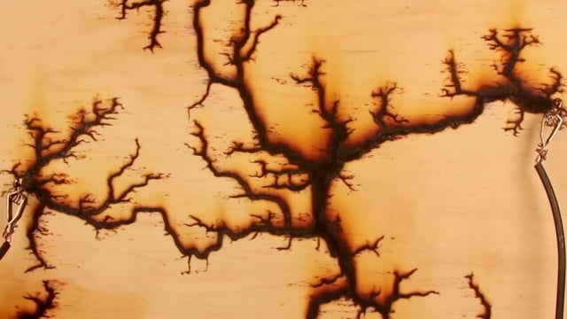 Melanie Hoff injected 15,000 volts into a sheet of plywood, with each electrical charge burning a fractal-style pattern into the wood, resulting in a unique, organic work of art. (Thanks Dion!)