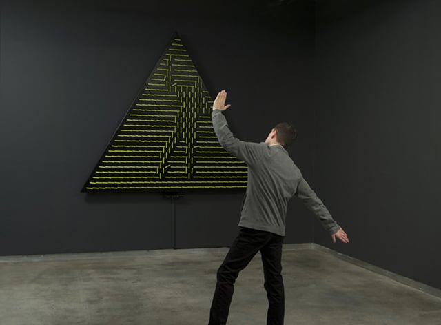 Artist Daniel Rozin’s latest interactive creation uses 465 motors and spokes to create geometric shapes, wavy lines, and replicates the movements of those who stand in front of it. Available through Bitforms Gallery NYC.