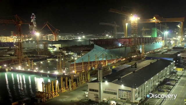 Watch three months of time compressed down to 76 seconds, as Discovery captures the construction of the world’s largest ship, the Maersk Line’s 400m long Triple-E vessel, assembled in Okpo, Korea.