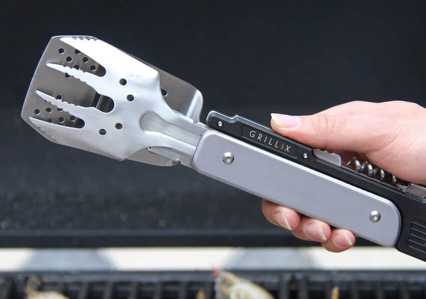 Grillix’s versatile BBQ tool is a lightweight cooking utensil that combines a pair of tongs, a fork, a spatula, a knife, a bottle opener, and a corkscrew. The fork and spatula have folding mechanisms, while the knife has a safety lock.