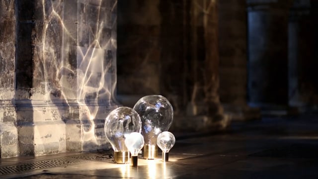 By creating a set of mouth-blown glass fixtures which turn on motorized bases, then illuminating them with halogen light sources, Poetic Lab produced a stunning lighting effect reminiscent of light bouncing off of slowly rippling water.