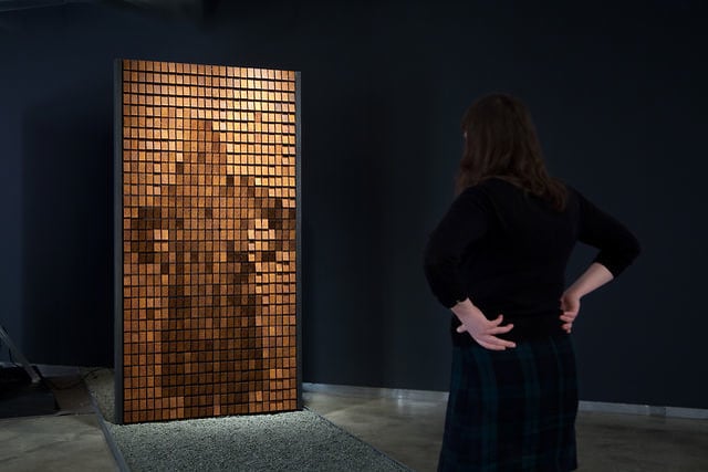 Daniel Rozin built this interactive sculpture which reflects movements of bystanders onto 768 oxidized steel tiles, controlled by motors which angle them to create shades of light and dark.