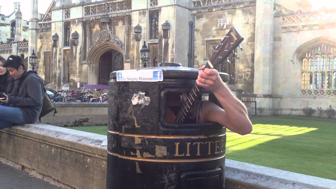 Street performers are always looking for new ways to catch the eye of passers-by. This Cambridge UK musician stands out from the crowd by playing in the most unconventional of venues – inside a trash bin.